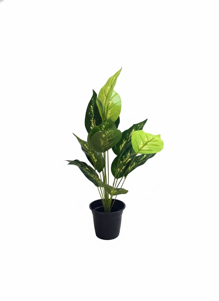 This is a decorative indoor plant with lush green leaves featuring light yellow patterns, giving it a fresh and natural look. The plant is neatly arranged in a simple black pot, making it perfect for home, office, or shop décor. It adds a calm, elegant touch to any space and is ideal for tabletops, corners, or shelves. Low maintenance and visually appealing, this plant enhances the beauty of interiors effortlessly.