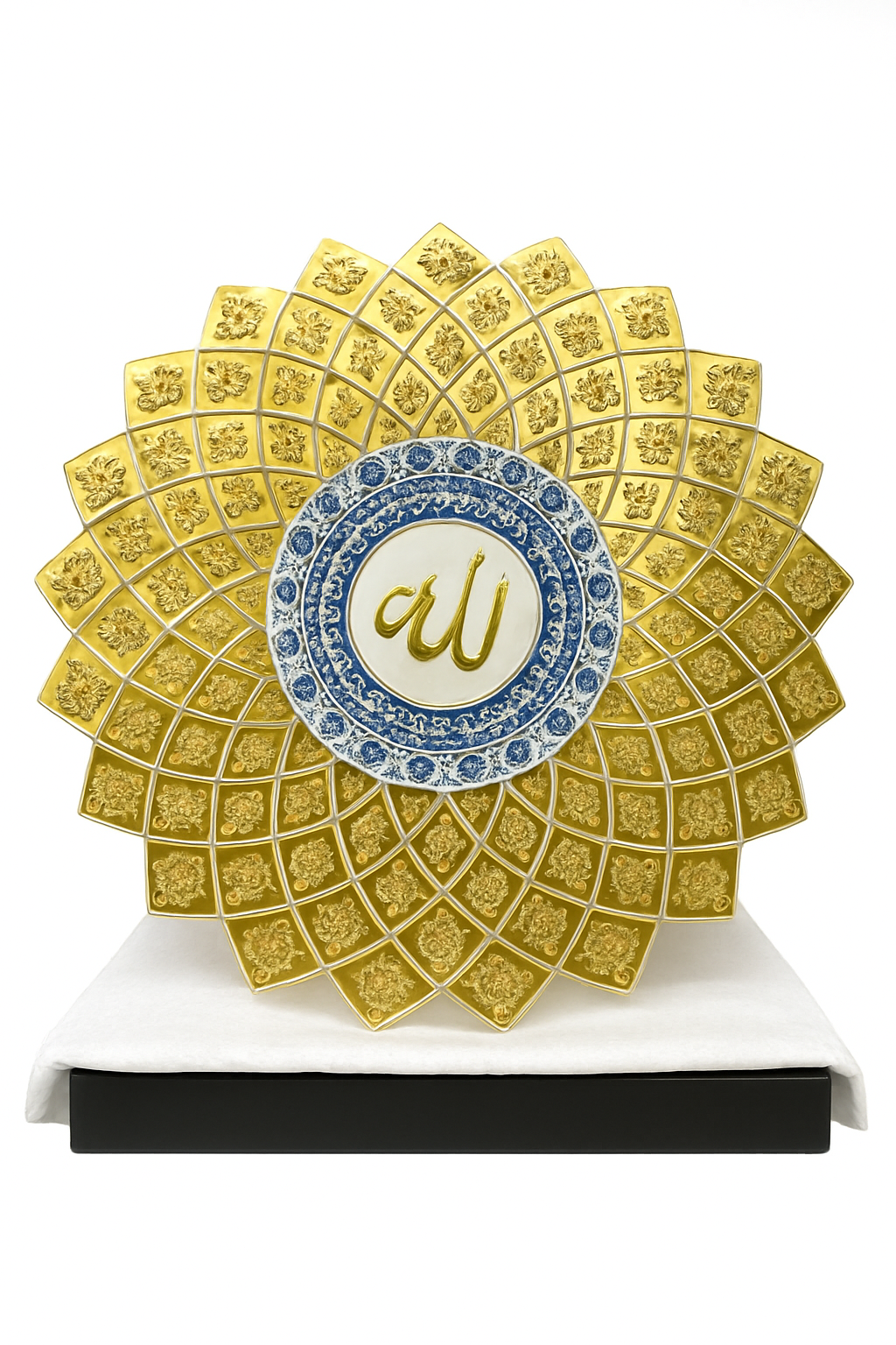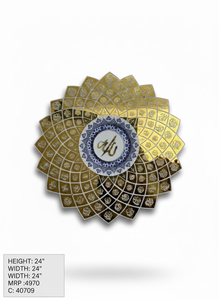 This product is a premium per acrylic cutout wall frame designed in a stunning flower shape, specifically crafted to showcase the 99 names of Allah (Asmaul Husna) in Arabic calligraphy at its center. The frame combines high-quality golden acrylic sheets with intricate laser-cut detailing, displaying each of the divine names elegantly across its layered petals, thus radiating both beauty and spiritual significance. Featuring integrated LED lighting, this wall frame not only highlights the artistry and craftsmanship but also provides a captivating ambient glow, making it an ideal decor piece for homes, offices, or places of worship.[homedecorcompany +4]
