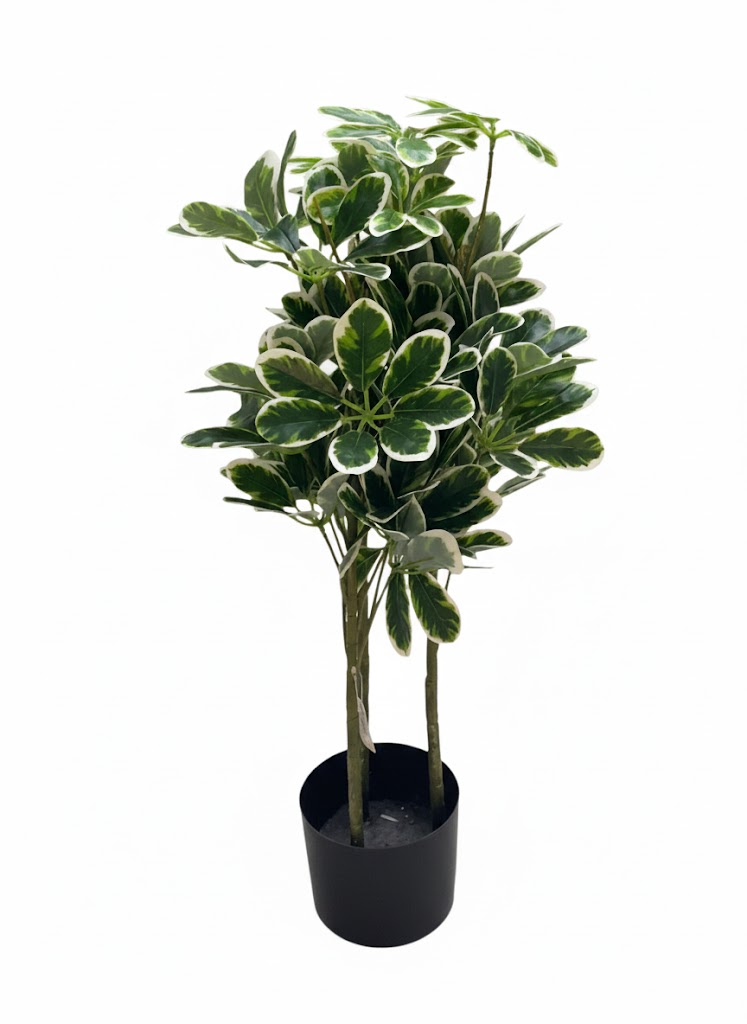 This is a beautiful artificial indoor plant with lush green leaves featuring white edges. The plant comes in a black pot, making it perfect for home or office décor. Its realistic leaves and neat design add a fresh and elegant look to any space. Since it is artificial, it requires no maintenance and stays green all year round.