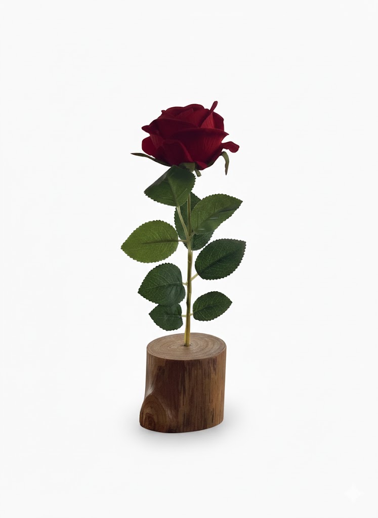 A beautifully crafted single red rose decor piece designed for an aesthetic and elegant look. The vibrant rose is placed in a natural-looking wooden stand, giving it a simple yet premium appearance. The calligraphy wall art and greenery in the background enhance the overall beauty of the setup, making the rose stand out even more.