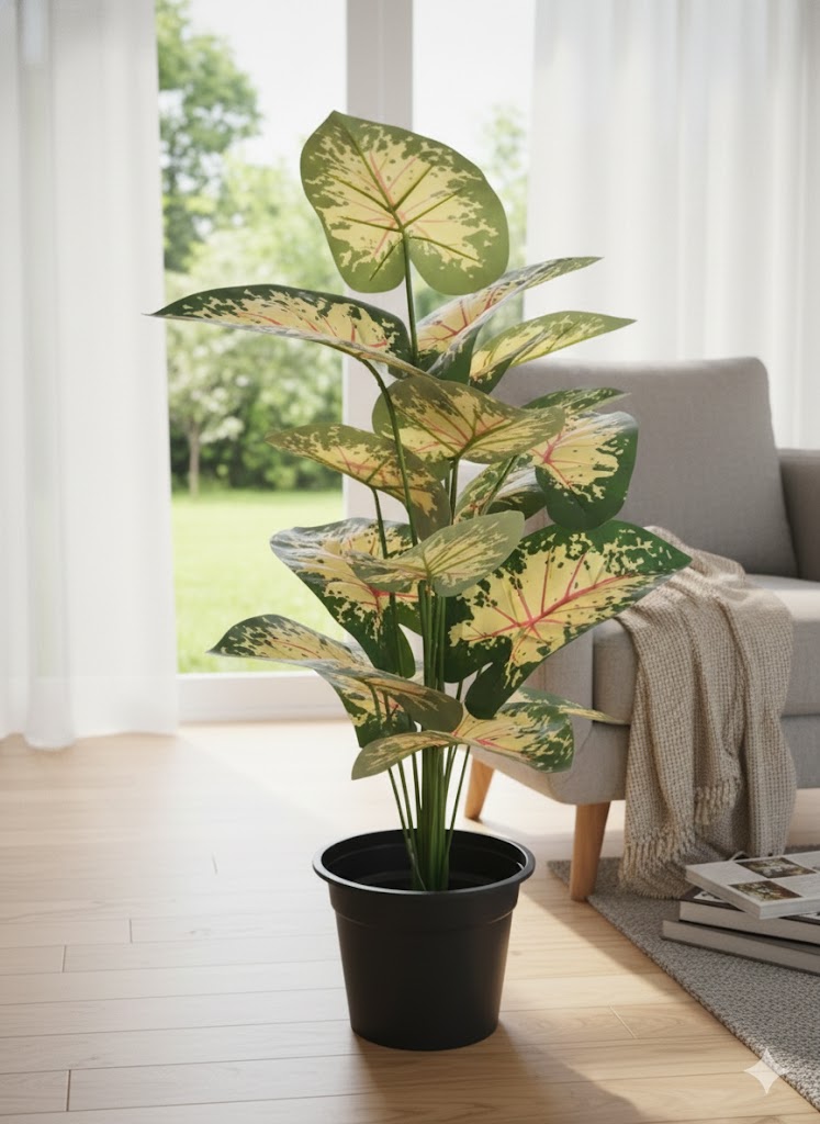 This is an attractive decorative indoor plant with broad, heart-shaped leaves in green and cream shades, highlighted by soft pink veins. The unique leaf patterns give the plant a vibrant and elegant look. Placed in a simple black pot, it is perfect for homes, offices, shops, or showrooms. It adds a fresh, colorful touch to interiors and enhances the overall décor.