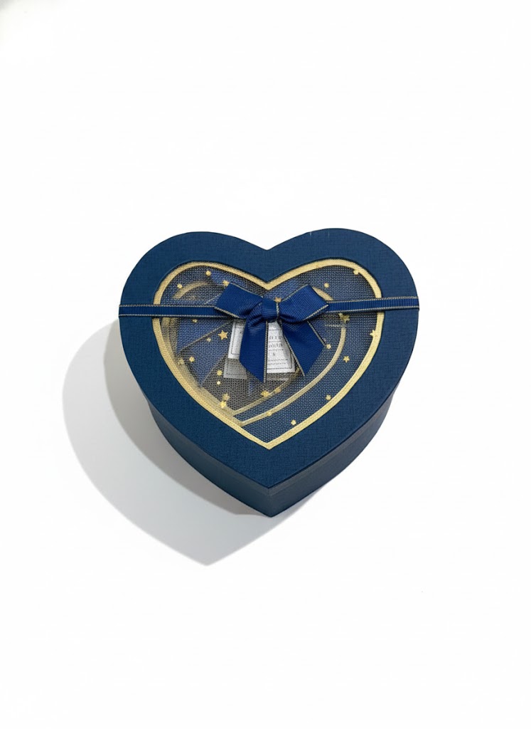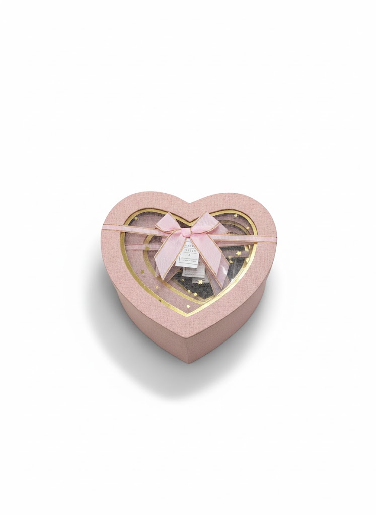 This is a heart-shaped gift box with a soft pink fabric finish, designed to give an elegant and charming look. The box features a beautiful layered heart design with golden borders and transparent detailing at the center. It is adorned with a pink satin ribbon and bow, along with a small tag that adds a premium touch.