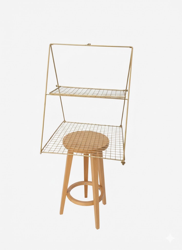This is a minimalist gold metal two-tier wire shelf/stand designed with a sleek and elegant look. Made from a sturdy metal frame with a gold finish, it features two wire-grid shelves that are lightweight yet durable. This stand is ideal for indoor décor, plant display, retail product showcasing, or use as a kitchen or bedroom organizer. Its modern and aesthetic design adds a stylish touch to any space while keeping items neatly arranged.