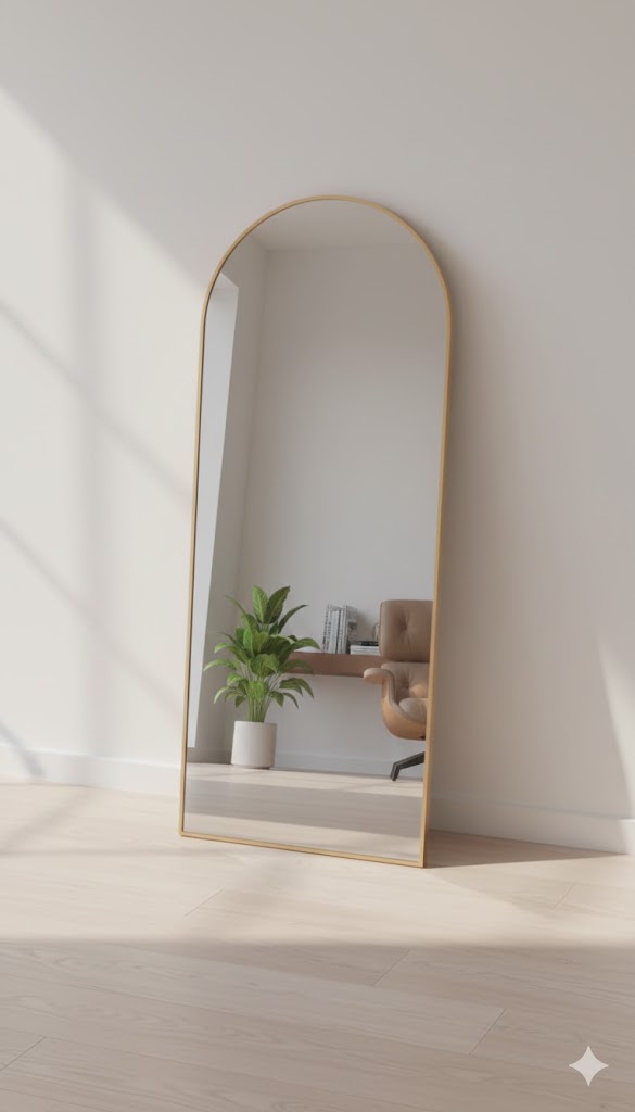 This is a full-length standing mirror with a sleek gold metal frame and an elegant arched top. The mirror is tall enough to show your entire reflection from head to toe, making it perfect for dressing rooms, bedrooms, boutiques, and modern interior spaces.