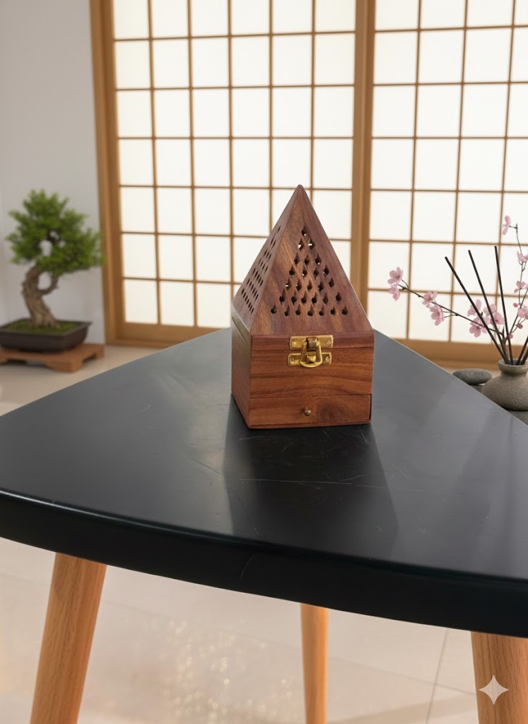 This is a beautifully handcrafted incense burner made from natural wood, designed in a pyramid shape with carved ventilation holes. The top section allows the smoke to flow out gently, creating a calming and aromatic atmosphere. It comes with a secure brass latch and a smooth wooden finish that adds an elegant touch to any space.